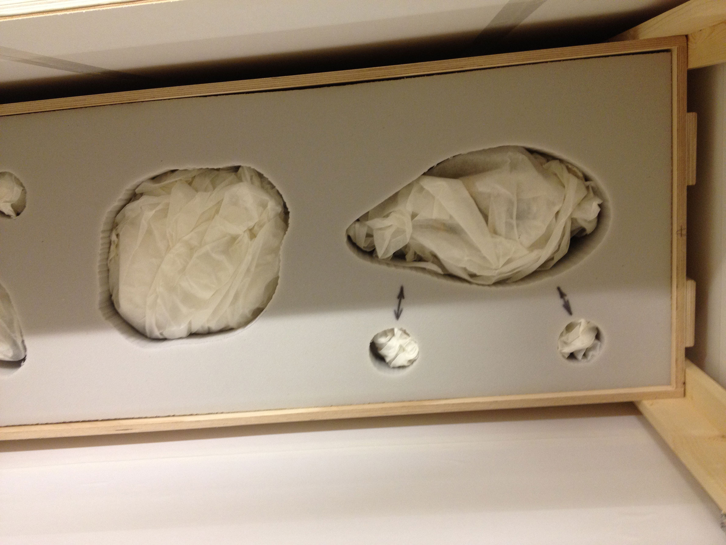 Bij het inrichten van elke nieuwe tentoonstelling leer ik weer bij. Zoals het vastzetten van kleine objecten met naalden en krimpkous, simpele steunen maken, ondersteunen en liften van objecten zodat ze beter tot hun recht komen.